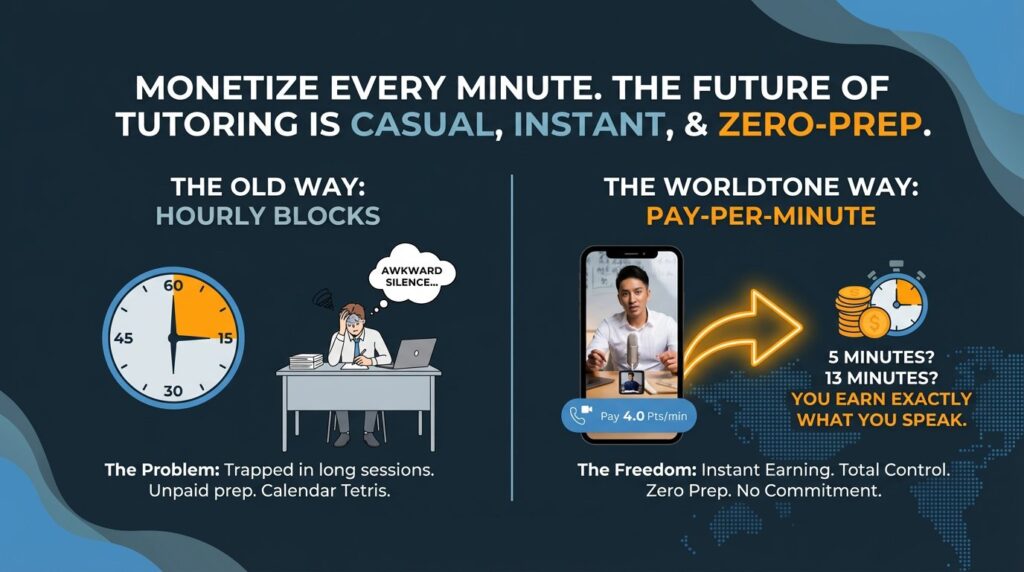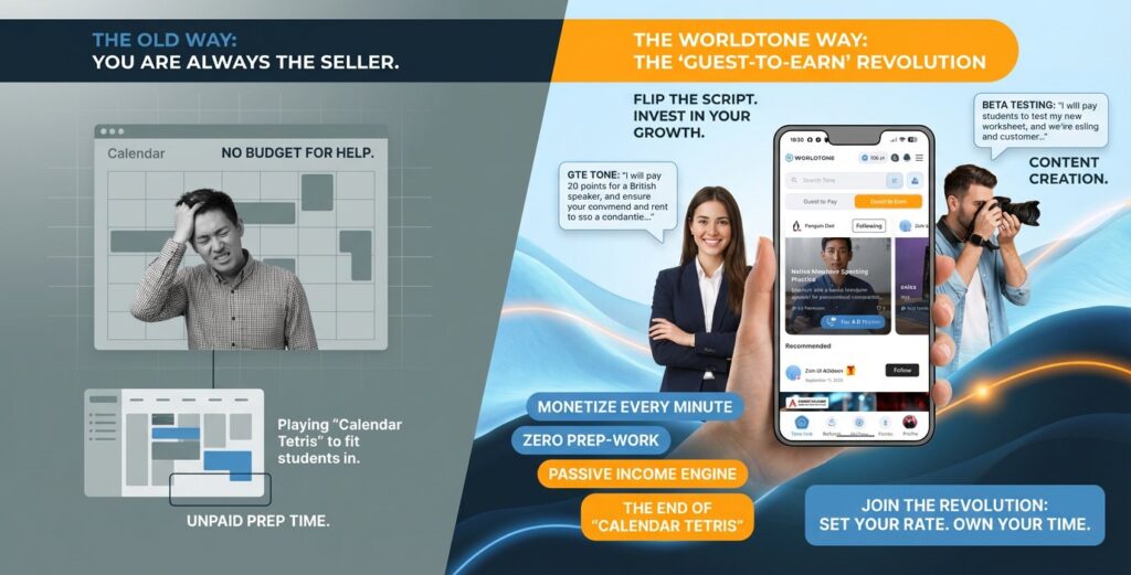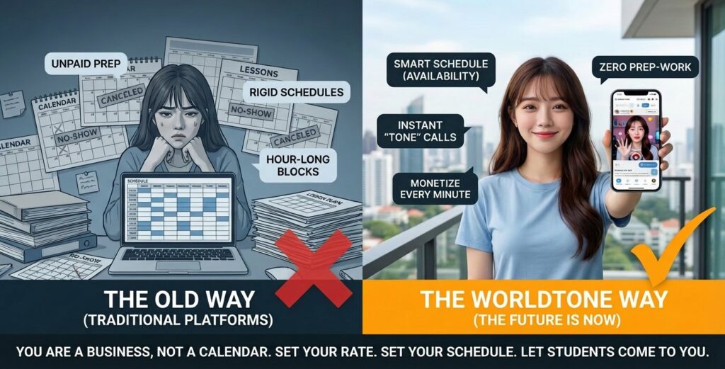 Enter WorldTone. We aren’t just another booking site. We are an On-Demand Video Marketplace designed to give teachers total control over their time, rate, and energy.