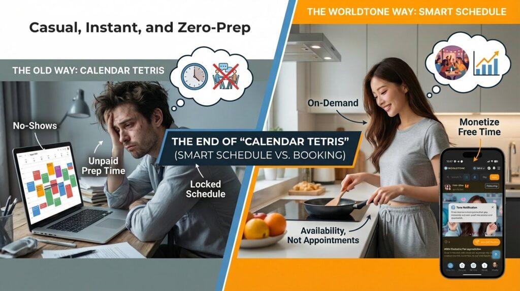 The Advantage: No more “No-Shows.” No more locking down your future schedule. You monetize your spare time instantly.